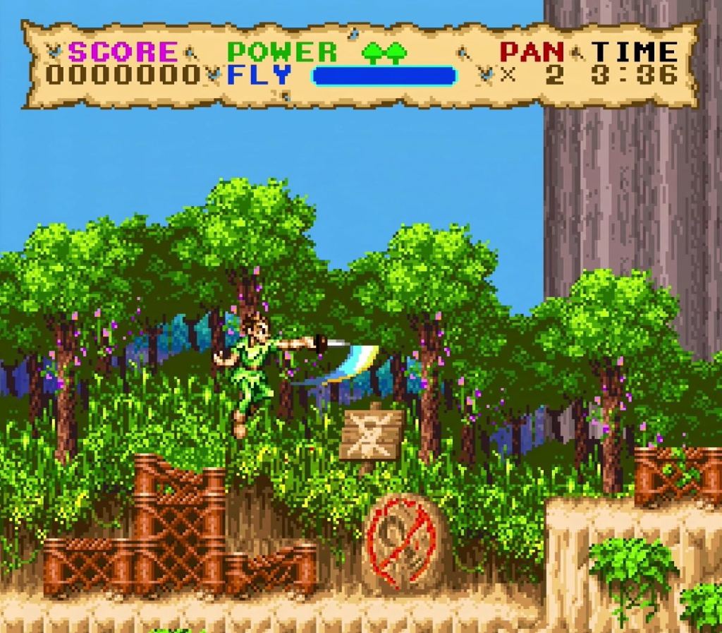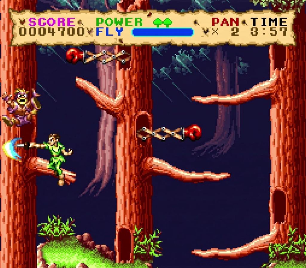 You start the game as Peter already in your green pyjamas, and on a quest to save your kids Maggie and Jack from the evil Hook. You travel all over Neverland, which is nicely outlined in the over world map (which you get to see between levels). The levels themselves are quite varied and colourful, often going places that were not touched upon in the movies like snowy mountains, waterfalls, or inside caves. The designs were also quite simplistic, often just having to move forward or up in the level with a few secrets here and there usually accessible with pixy dust.