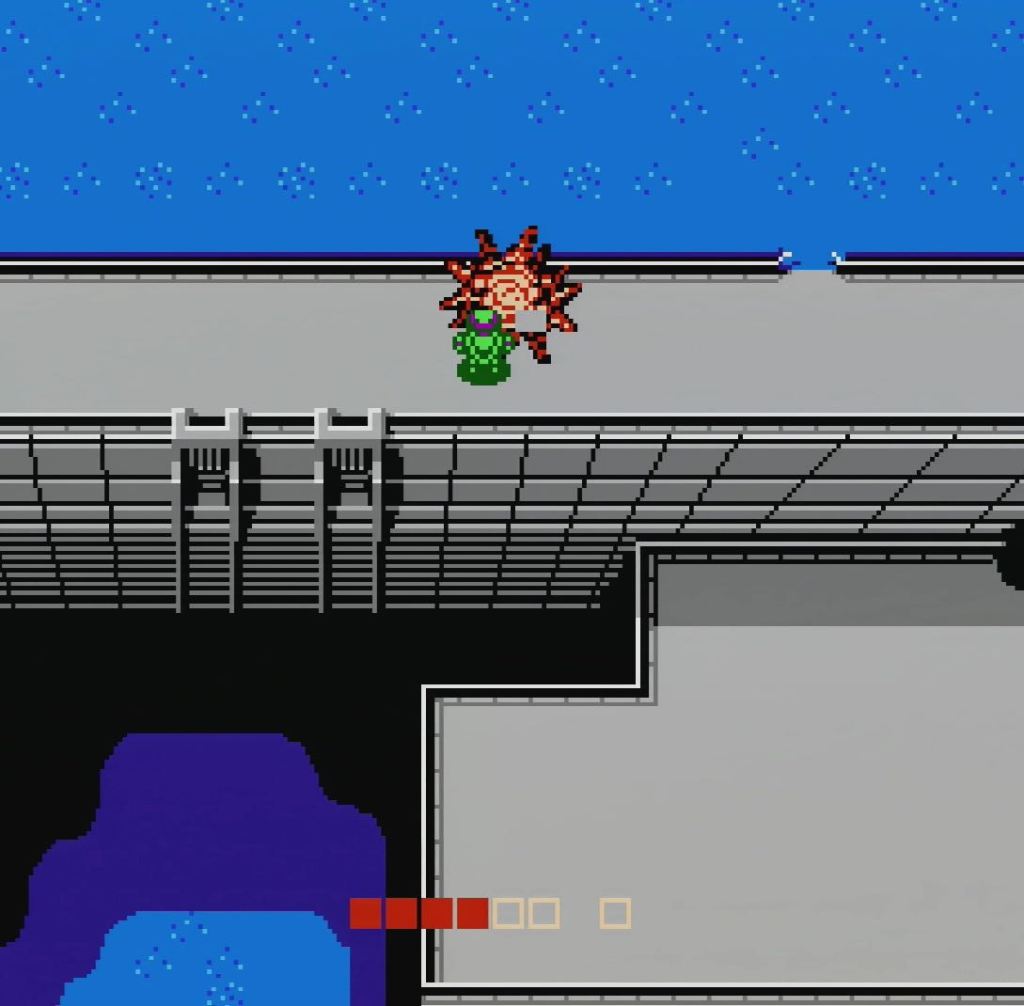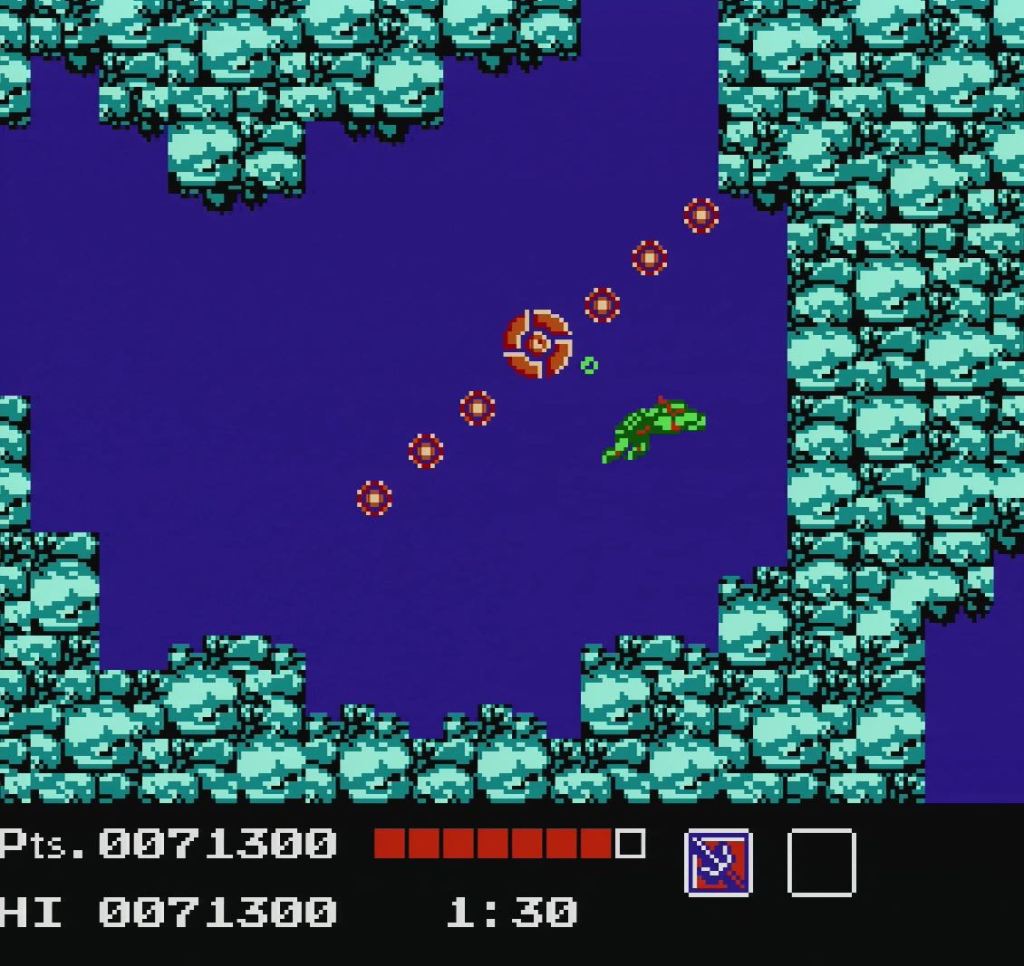 In this first TMNT iteration on the NES, you take control of the Turtles (selected one at a time) and make your ways through various levels (including over world maps which link together each side-scrolling level). There are no “lives” per se, but if one of the turtles looses all of his health, he get captured and must be rescued later on in the game.
