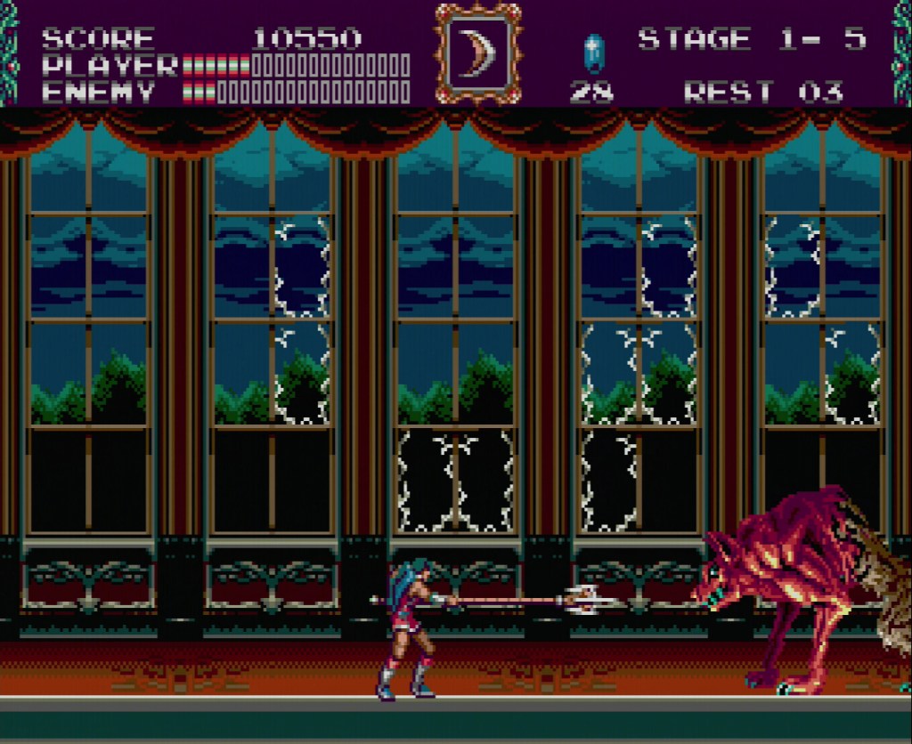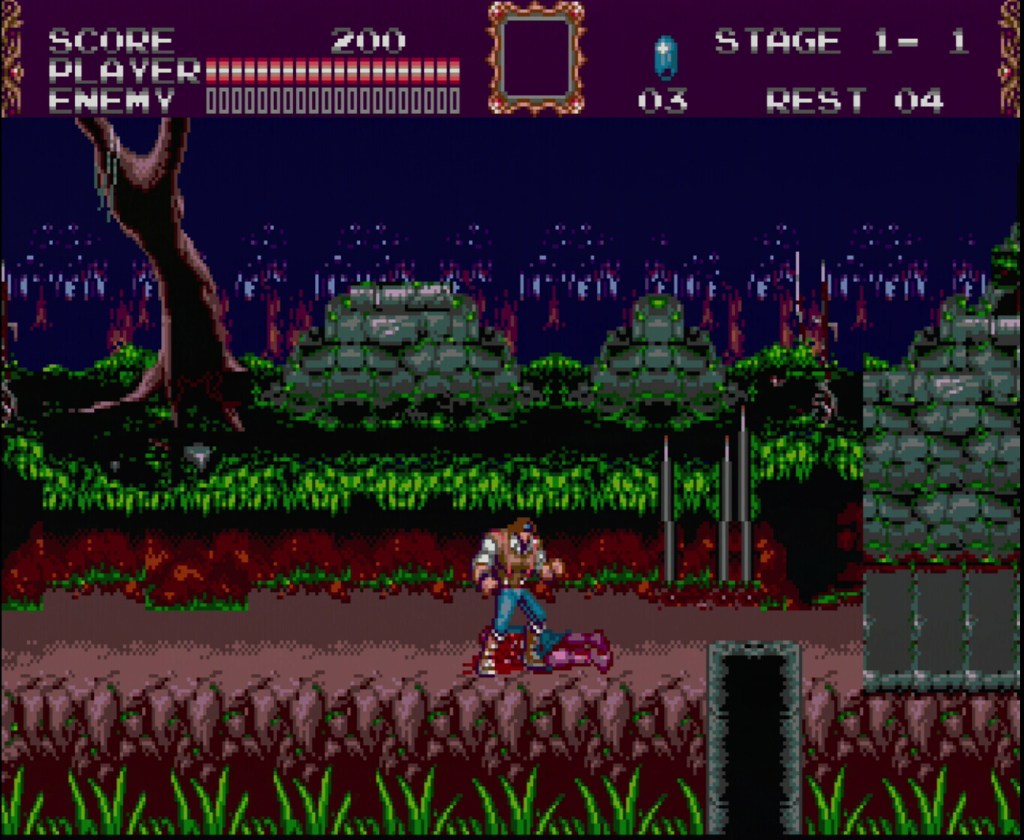 As usual, you take control of a Belmont (i.e., John Morris – a distant relative of the family) to hunt Dracula, but also have access to another main character Eric Lecarde! What makes this addition standout is that each character controls differently and has different moves. For instance, John has a whip, can swing Indiana Jones style, and make diagonal attacks while Eric has a giant spear, can make huge vertical jumps which can get him to secret areas, and can attack straight up while standing still. You cannot see the whole game without playing through the game as each of them!