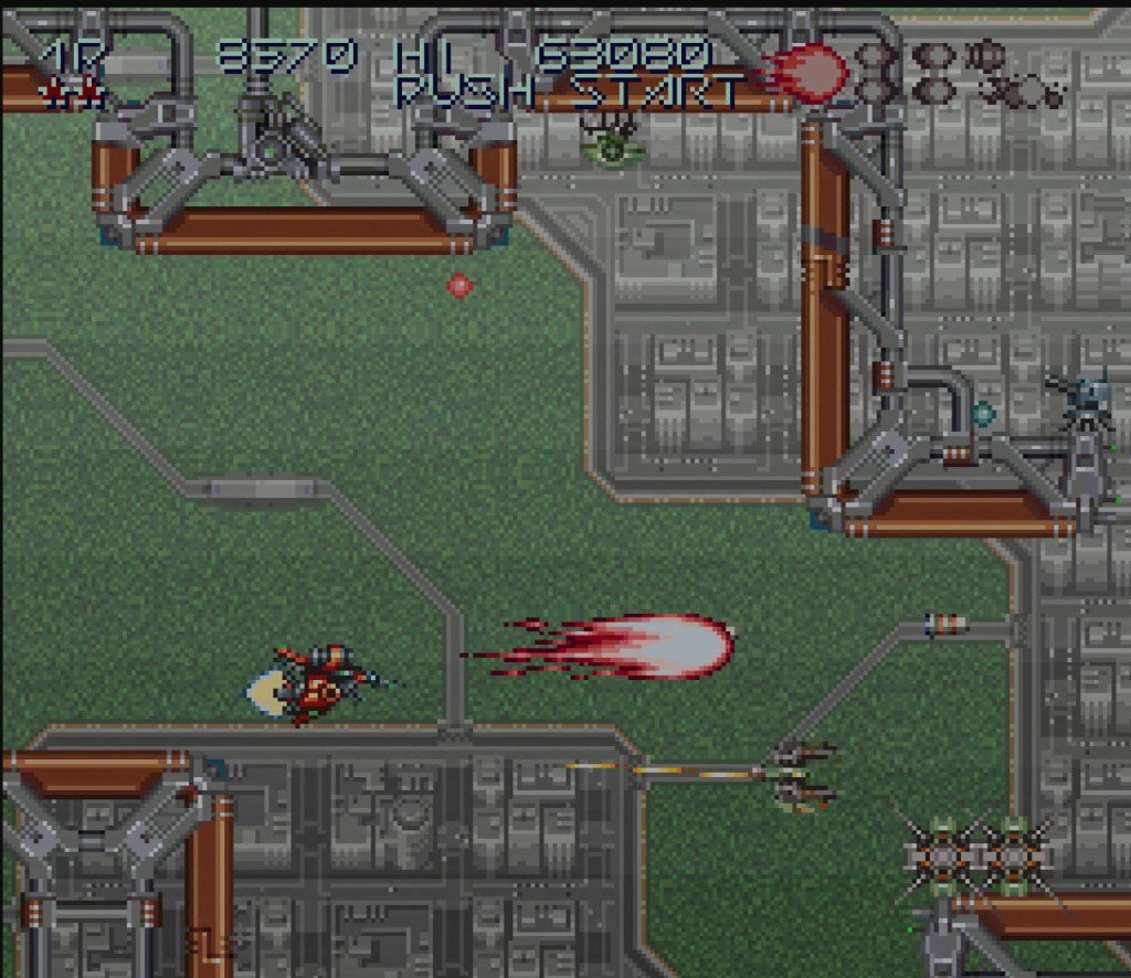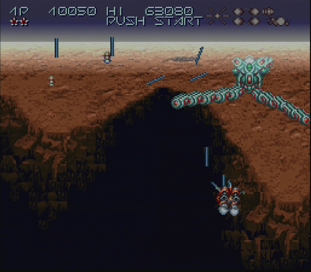 I terms of the graphics and visual effects, I really liked them! The developers really utilized the Mode 7 graphics of the SNES to bring a unique visual style to the game during the vertical levels. While slowdown is quite common in vertical shooters (think Gradius III), I experienced very little during my play through which was a welcome addition. The sound in this game was also phenomenal and upbeat, inclining me to continuously tap my foot during play.