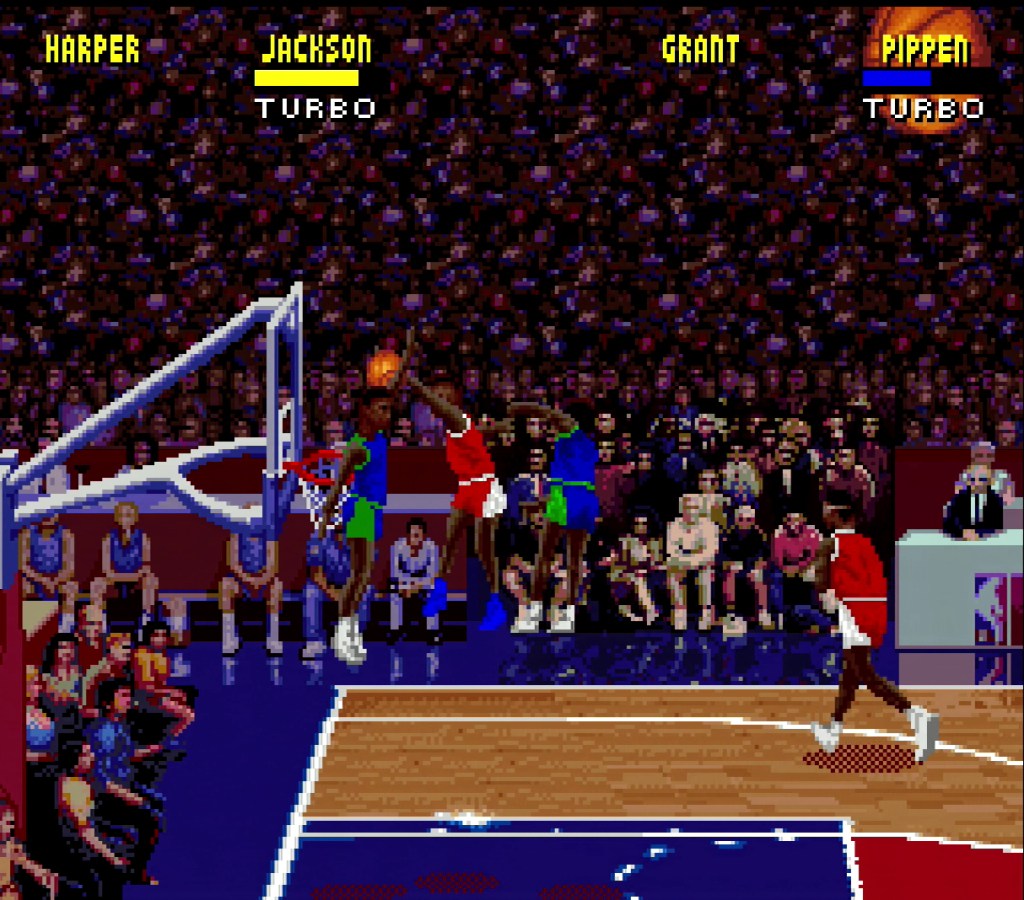 In terms of gameplay, you take control of a team in a 2 vs 2 matches. Controls are easy and arcade friendly – one button passes, one button shoots (or dunks), and one button turns on TURBO which makes the player run fast! I really like the simplicity of the controls because they are intuitive and because so much cools stuff can happen just with button sets! If the shoot button in pushed with the turbo button down while close to the net, players can do some amazing dunks! It’s just fun to see players fly high and smash that ball though the net! There just wasn’t enough dunk animations and they aren’t as fancy as they should have been.