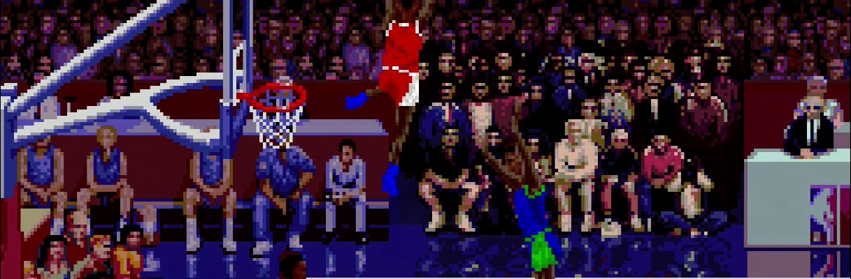 In terms of gameplay, you take control of a team in a 2 vs 2 matches. Controls are easy and arcade friendly – one button passes, one button shoots (or dunks), and one button turns on TURBO which makes the player run fast! I really like the simplicity of the controls because they are intuitive and because so much cools stuff can happen just with button sets! If the shoot button in pushed with the turbo button down while close to the net, players can do some amazing dunks! It’s just fun to see players fly high and smash that ball though the net! There just wasn’t enough dunk animations and they aren’t as fancy as they should have been.