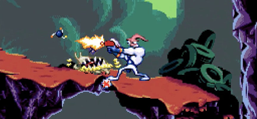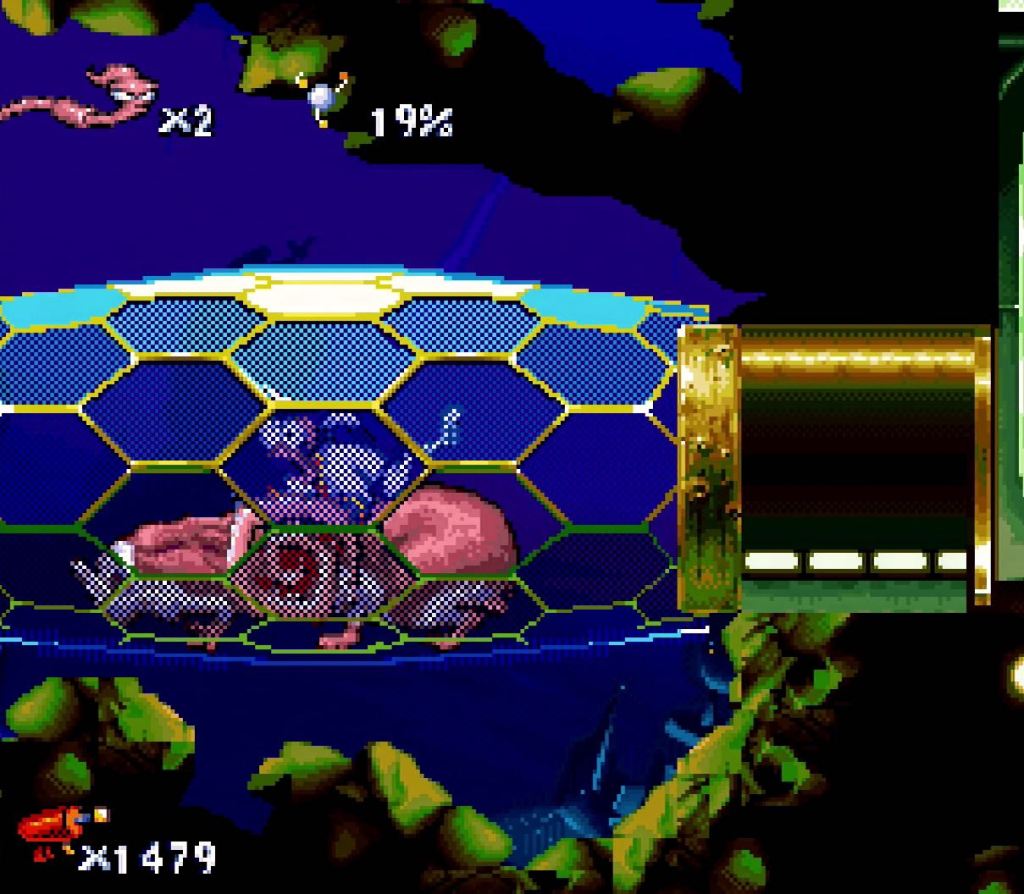 In terms of core design, this is an action platform game – you run, jump, and climb around as Jim shooting bad guys (or rabbid dogs, or crazy crows) with your gun in addition to whipping them with your earthworm head. You also have a few other tricks like propellering your head so you fall down more slowly and hooking your head onto hooks so you can swing like Indiana Jones! The stages that Jim gets to explore are also HUGE with lots of secret areas to find and power ups to collect like super guns, life, and extra lives!