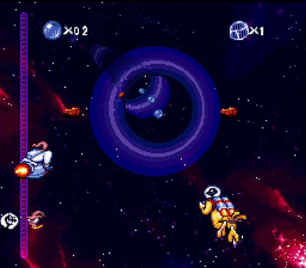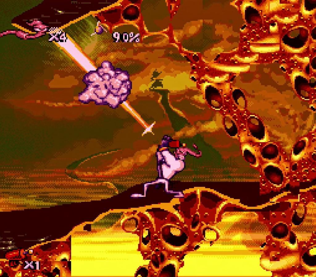 But Earthworm Jim is more than just a run and gun action platform game. Many stages veer away from this formula to add in a ton more variety which really makes this game shine. For instance, after the first level (and after many others), Jim gets to race on a rocket through the galaxy against his nemesis Psy-Crow. Later on, Jim also gets to ride a glass bubble through an underwater stage, ride a giant hamster, and even bungee jump with snot attached to him! The levels themselves are themed extremely well and look great and are NOT cliche! Yes – there are “fire” and “water” levels, but they take place in Hell or in an underwater science base so are unique both aesthetically and conceptually.