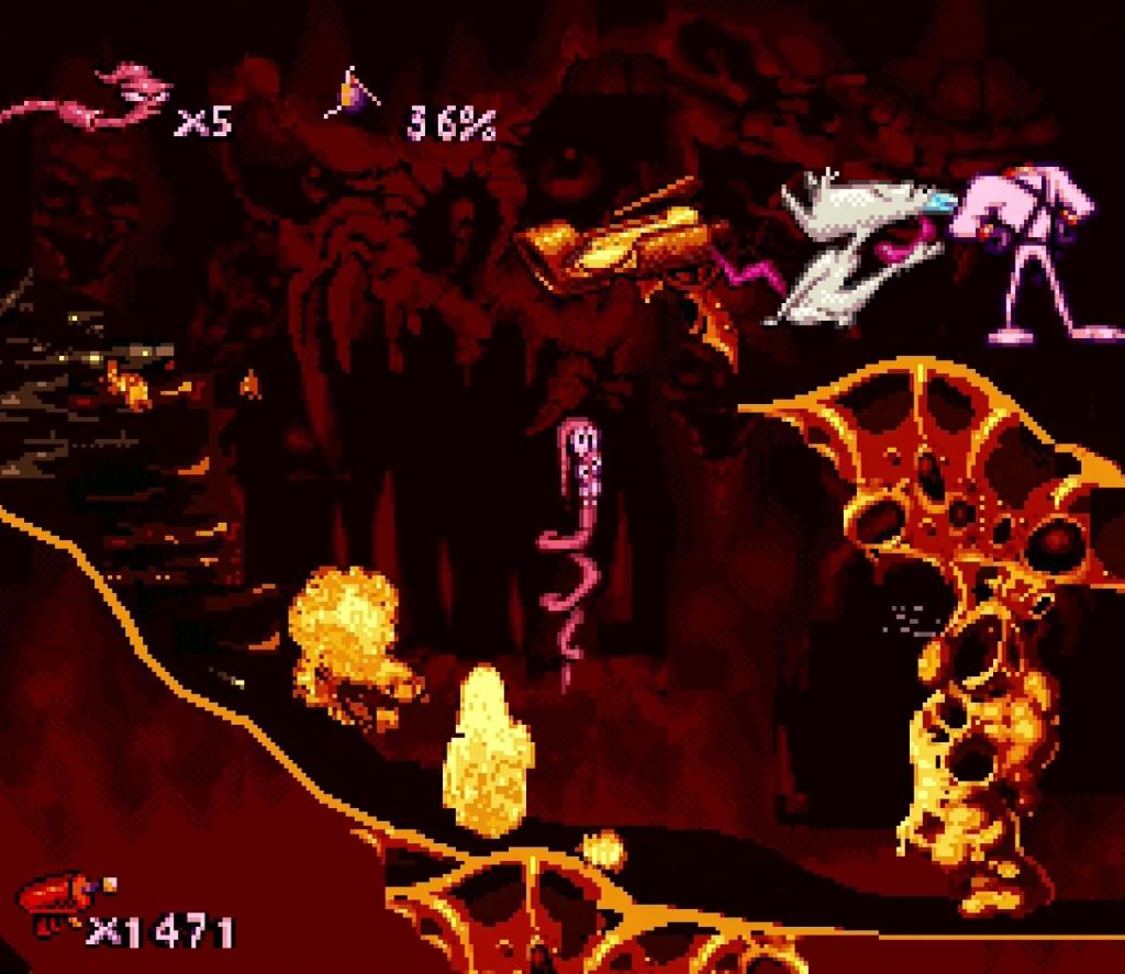 In terms of sound – this game rocks! Earthworm Jim is voiced and you get to hear him yell and scream throughout the game! The music suits the game extremely well to and is memorable. One of my favourites is the Hell level music as the cat in the background can be seen dancing back and forth to the beat! In terms of graphics, the game still looks fantastic with Jim and his enemies having tons of different animations, and the levels themselves looking like places you would want to explore!
