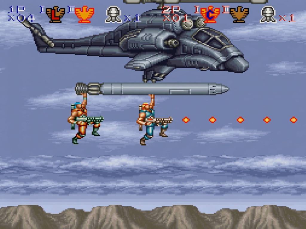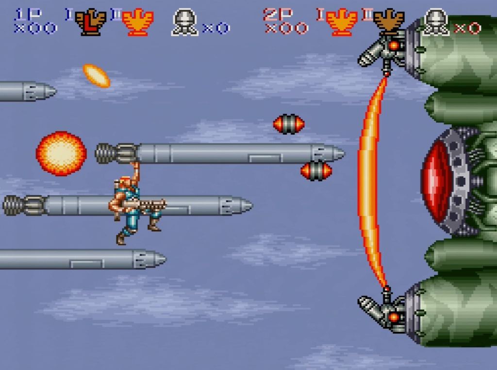 This game can be played as one or two player co-op and is a fast paced action game that takes the form of either a side-scrolling or top-down perspective. In the side-scrolling levels, you run from left to right, jumping and dodging over obstacles all the while shooting down enemies and eventually the stage boss. The levels are nicely varied and make each one a unique experience. For instance, the first side-scrolling level is  more horizontal where the player travels through city streets whereas the second level emphasizes verticality and scaling buidling. The third level emphasizes speed through riding motorcycles and missiles and the last level is vertical again just extremely challenging!