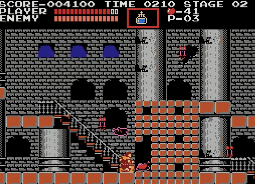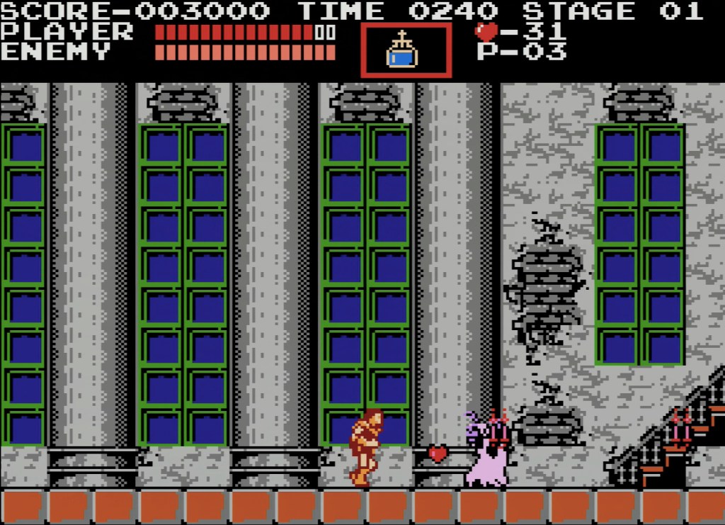 In terms of the action, Simon uses his trusty whip to destroy monsters, zombies, bats, and even the dreaded MEDUSA HEAD (which lead to my repeated pit deaths)! The player can also get numerous secondary weapons ranging from knives, axes, holly water, among others, which help kill oddly placed enemies and bosses with weird movement patterns. The player can only hold one secondary weapon at a time, so if you find one that you like (e.g., the knife), don’t touch any of the others because you never know when you will find another!